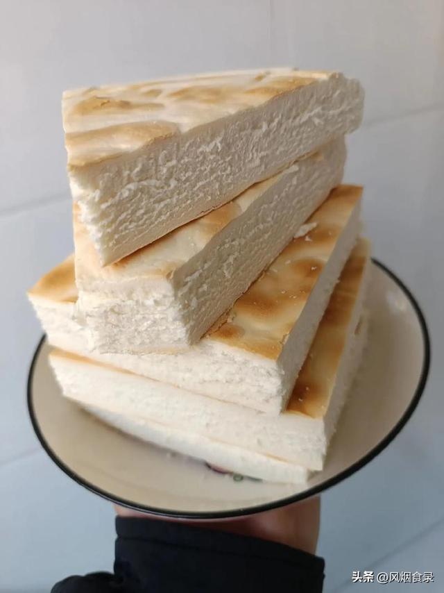 吃的时候得用快刀切薄片,夹上卤牛肉或抹上西瓜酱,一口下去,香酥柔润,虽干不燥,越嚼越有劲,放几天都不硬。