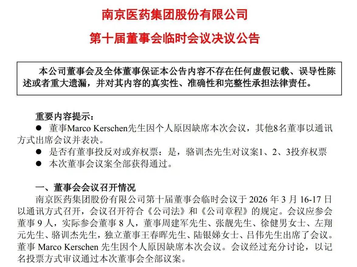 根据南京医药当天发布的另外一则公告,Marco Kerschen和骆训杰原定任期到期日为2028年6月5日,也就是说,两人提前两年多离任。公告称,《关于免去公司第十届董事会部分董事的议案》尚需提交公司股东会审议,股东会审议通过上述议案后,骆训杰、Marco Kerschen不再在公司担任任何职务。