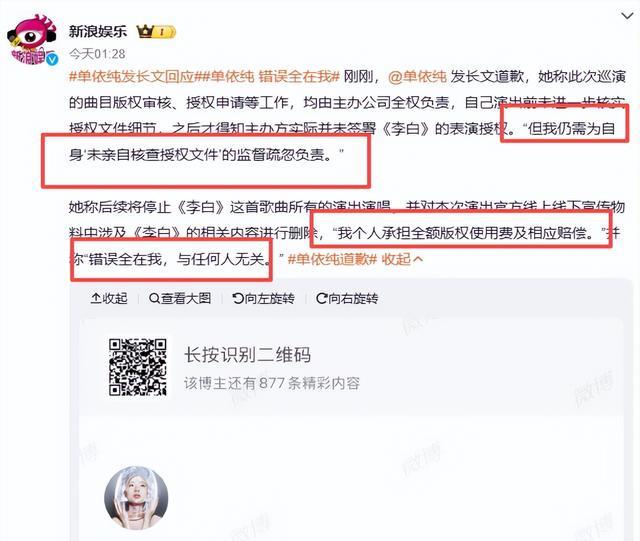 她还主动表态,愿意承担全额版权使用费和相应赔偿,还说“错误全在我,与任何人无关”,态度看起来十分诚恳。
