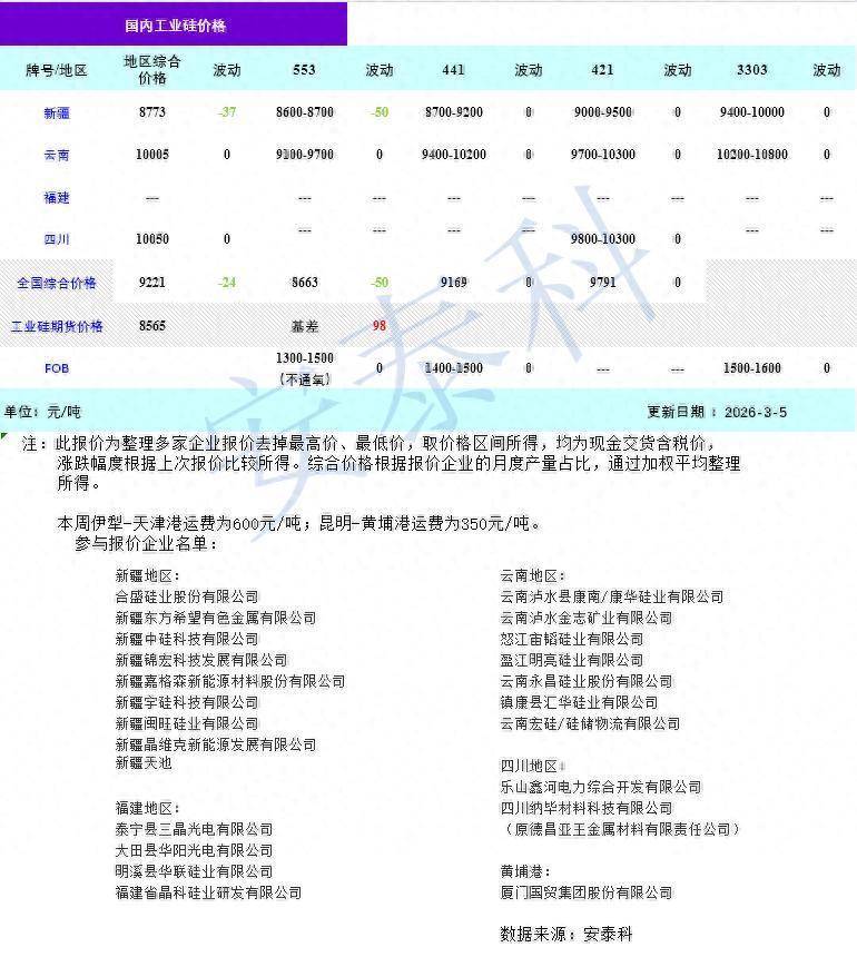 据安泰科3月5日现货价格统计,全国工业硅综合价格为9211元/吨,较节前下跌24元/吨。分规格看,553#报价降价50元/吨至8663元/吨,441#报价持稳于9169元/吨。区域市场中,新疆、云南及四川综合价格分别为8810元/吨、10005元/吨和10050元/吨,价格体系未发生明显变化。出口FOB价格亦与上周持平。
