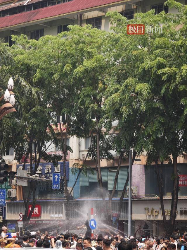 在西双版纳景洪市泼水节广场四周街道,泼水节狂欢一路蔓延,有人驾驶皮卡车,将车斗装满水沿街喷洒,甚至还有洒水车加入其中。同时,路边游客也将水枪对准他们,彼此“激战”。