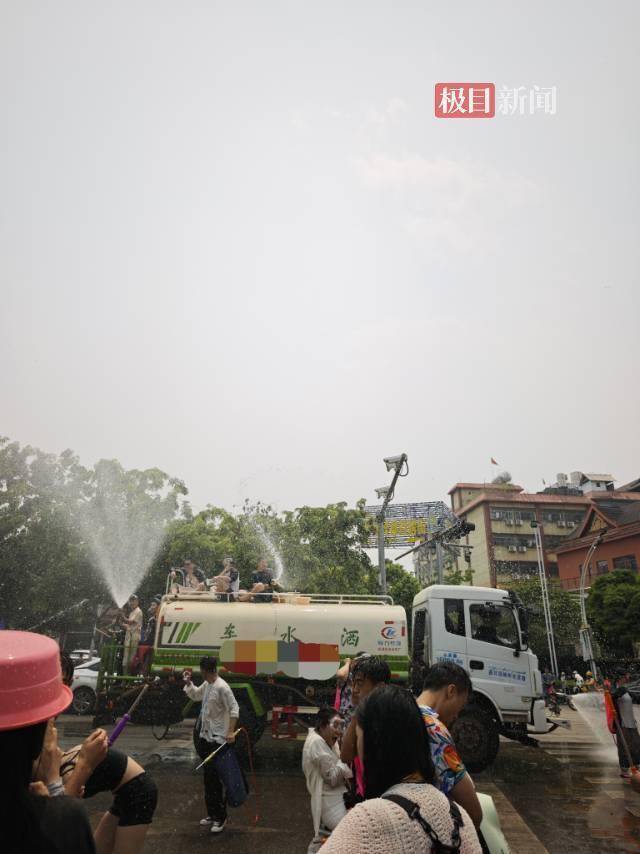 在一处街道路牌旁,不少游客轮番站上高处,接受周围游客的喷水“洗礼”,还有人直接拿出洗发水,借着游客们水枪的水流,现场表演洗头。